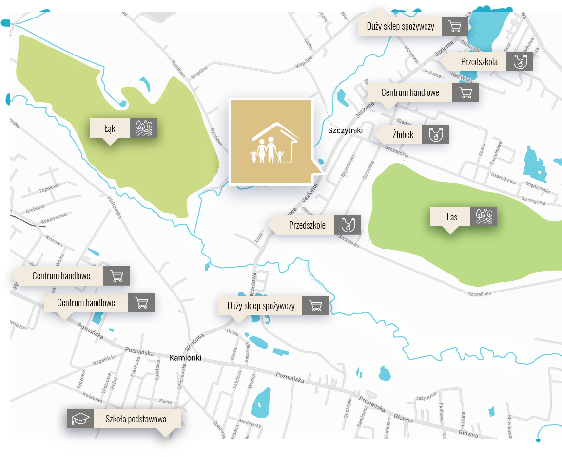 Inwestycja położona jest na spokojnym, otoczonym lasami i terenami rekreacyjnymi osiedlu nowoczesnych domów jednorodzinnych przy ulicy Choinkowej w Szczytnikach koło Poznania.